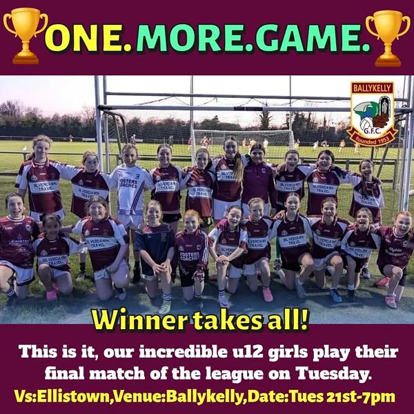 Best of luck to Ballykelly U12 girls in their big match tomorrow night against Ellistown!
