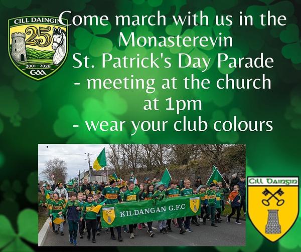 It would be fantastic to see a big turnout as we celebrate our 25th anniversary year and proudly represent Kildangan GAA in one of the highlights of the local St. Patrick’s Day celebrations.