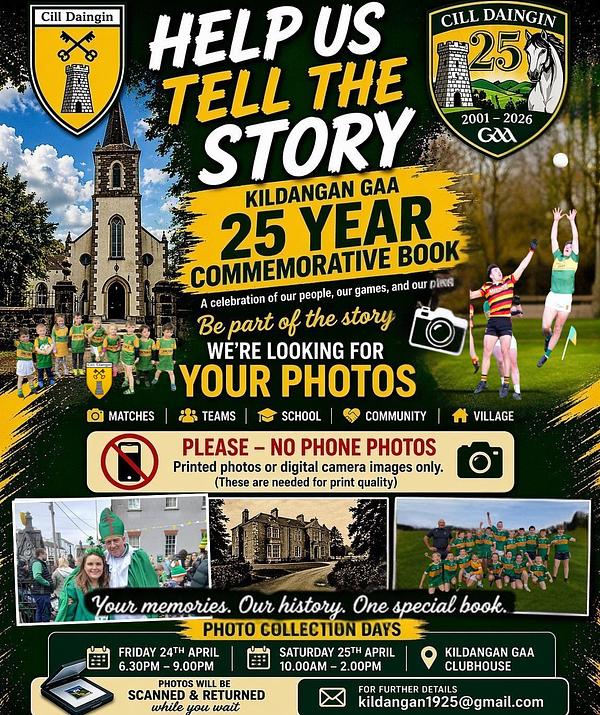 As part of our 25 year celebrations, Kildangan GAA is preparing a special commemorative book to mark the milestone — and we are asking the community to help us shape it.
