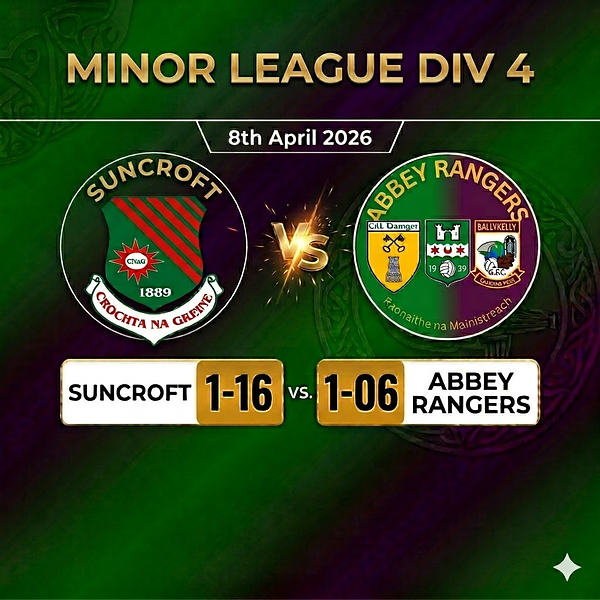 Unfortunately, it was all Suncroft in the final quarter with several points scored without reply. Finally, the pressure Suncroft were putting on the Abbey Rangers defence resulted in a penalty in the last minute. This was confidently scored to end the game on a score line of Suncroft 1-16 to Abbey Rangers 1-06.
